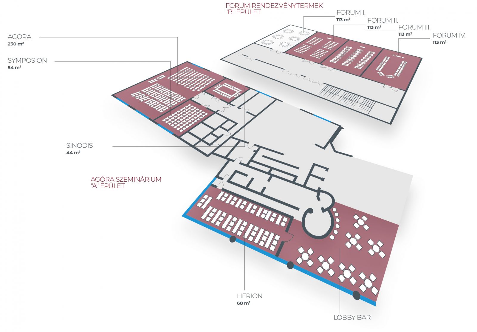The conference and meeting rooms have natural light (except the two central sections of the Forum ), the Agora and Sinodos rooms have a terrace and a buffet can be set up on request. The rooms can be connected together to accommodate up to 350 people. The equipment is not fixed and can be changed on request.